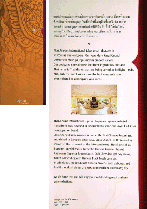 In 2001, THAI Airways has selected Thai Scala Shark's Fin Restaurant (InterContinental Hotel) to serve Royal First Class cabin passengers.
